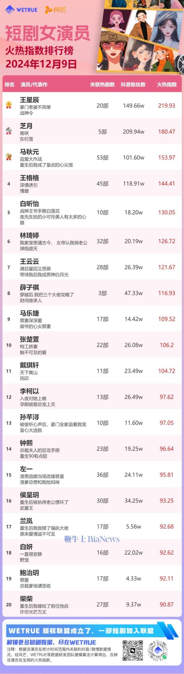 12月10日音讯,为匡助短剧从业者提供更多信息,专注于短剧报谈的新腕儿和科技媒体鞭牛士集结WETRUE短剧热度榜共同推出多种短剧热度榜。 本榜单为短剧女演员amp;男演员火热指数名次榜。 术语阐扬见海报左下角。 今天发布的是12月9日榜单。 在短剧女演员榜单中: 王星辰关联热剧数20部,抖音粉丝数149.66万,火热指数219.93,排名第一; 芝月关联热剧数5部,抖音粉丝数209.94万,火热指数180.47,排名第二; 马秋元关联热剧数53部,抖音粉丝数101.60万,火热指数153.97...