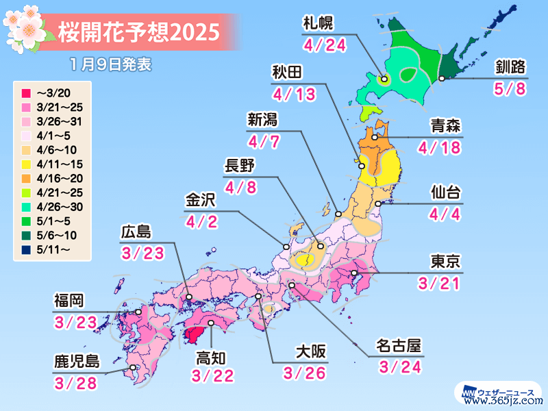 1月5日的时候,冲绳的樱花开了,是以我们推理了一下本年日本的樱花期,我是合计本年樱花好像率会晚一些。前两天,日本官方的樱花料念念精采发布了。按照旧例,放两个料念念,一个是日本风景株式会社,一个是weathernews。
