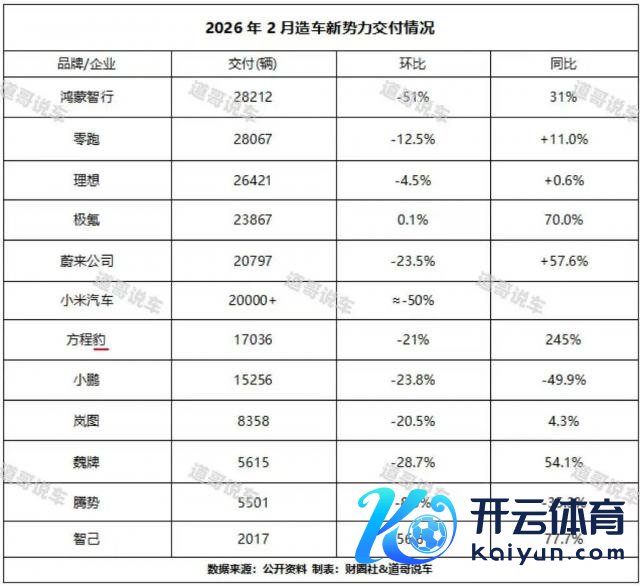值得一提的是,从环比下滑幅度来看,理思汽车 2 月销量跌幅不大,在市集举座遇冷的布景下展现出一定的抗跌性,但同比增幅仅为 0.6%,销量增长压力依旧不小。统计中,其余车企月销量均未朝上 2 万辆,包括往日一年销量发达出色的小鹏汽车,和销量稳步增长的方程豹以及岚图汽车。