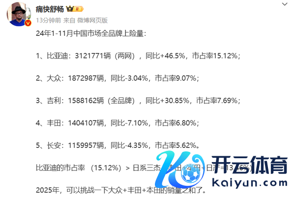 博主骁勇预测,2025年比亚迪有望挑战天下、丰田和本田销量之和。荒谬是在2024年11月,比亚迪再次刷新记载,单月销量打破50万辆大关,联络两个月保捏这一水平。适度11月,比亚迪全年销量已达375万辆,瞻望全年将越过420万辆。