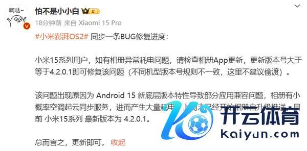 这个问题的原因是Android 15新底层版块特质导致部分期骗兼容问题,相册有小概率会同样调起云同步作事,从而产生大王人耗电。上周末还是开动相册自升级推送,当今小米15系列的最新版块为4.2.0.1。