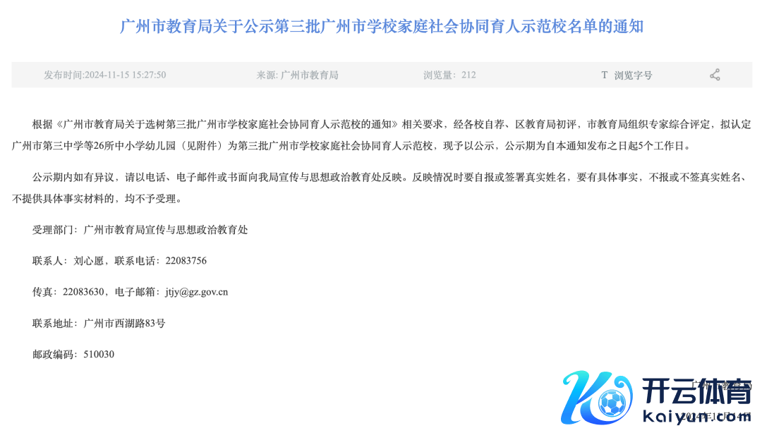 近日,广州市教师局发布对于公示第三批广州市学校家庭社会协同育东谈主示范校名单的见知。见知清晰,阐发接头条款,经各校自荐、区教师局初评,市教师局组织群众详尽评定,广州市教师局拟认定广州市第三中学、广州市二商幼儿园、荔湾区沙面小学、广州市西关番邦语学校、广州市培英中学、广州市南武中学、广州市五中滨江学校、河汉区四海小学、河汉区奥体东小学、白云区江村中学、白云区黄边小学、白云区云雅推行学校等26所中小学幼儿园为第三批广州市学校家庭社会协同育东谈主示范校,公示期为自见知发布之日起5个责任日。