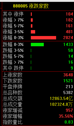 市集共3648只个股高涨,104只个股涨停,1521只个股着落。