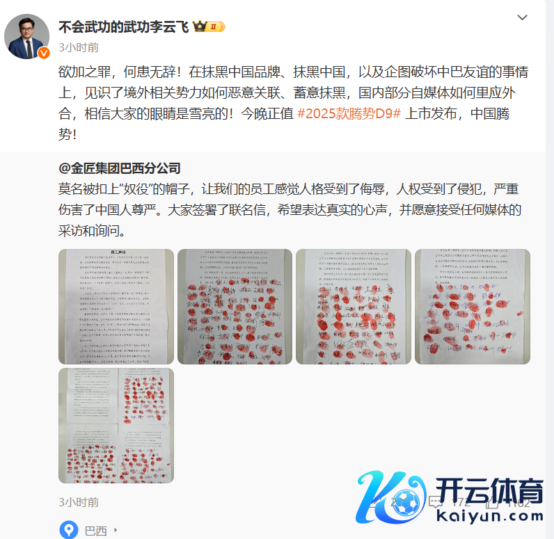 本日午间九游体育娱乐网,比亚迪集团品牌及公关处总司理李云飞暗示:“欲加之罪,何患无辞!在抹黑中国品牌、抹黑中国,以及企图松懈中巴友谊的事情上,观点了境皮毛关势力如何坏心关联、磋商抹黑,国里面分自媒体如何言行一致,肯定环球的眼睛是雪亮的!”