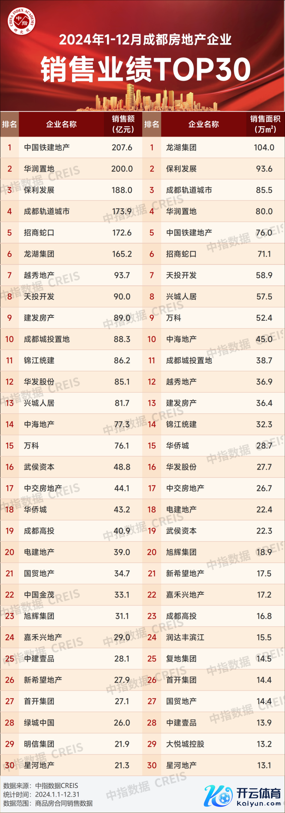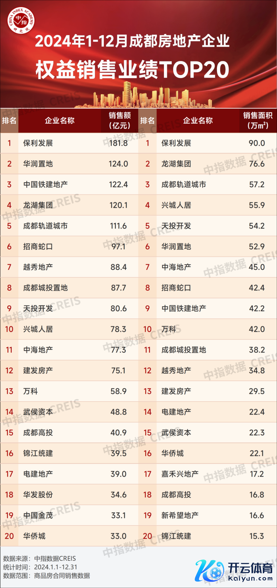 成齐市2024年1-12月房地产职权销售功绩TOP20中,保利发展、华润置地、中国铁建地产、龙湖集团和成齐轨说念城市职权销售额冲破100亿,招商蛇口、越秀地产、成齐城投置地、天投迷惑、兴城东说念主居、中海地产、建发房产和万科职权销售额超50亿。