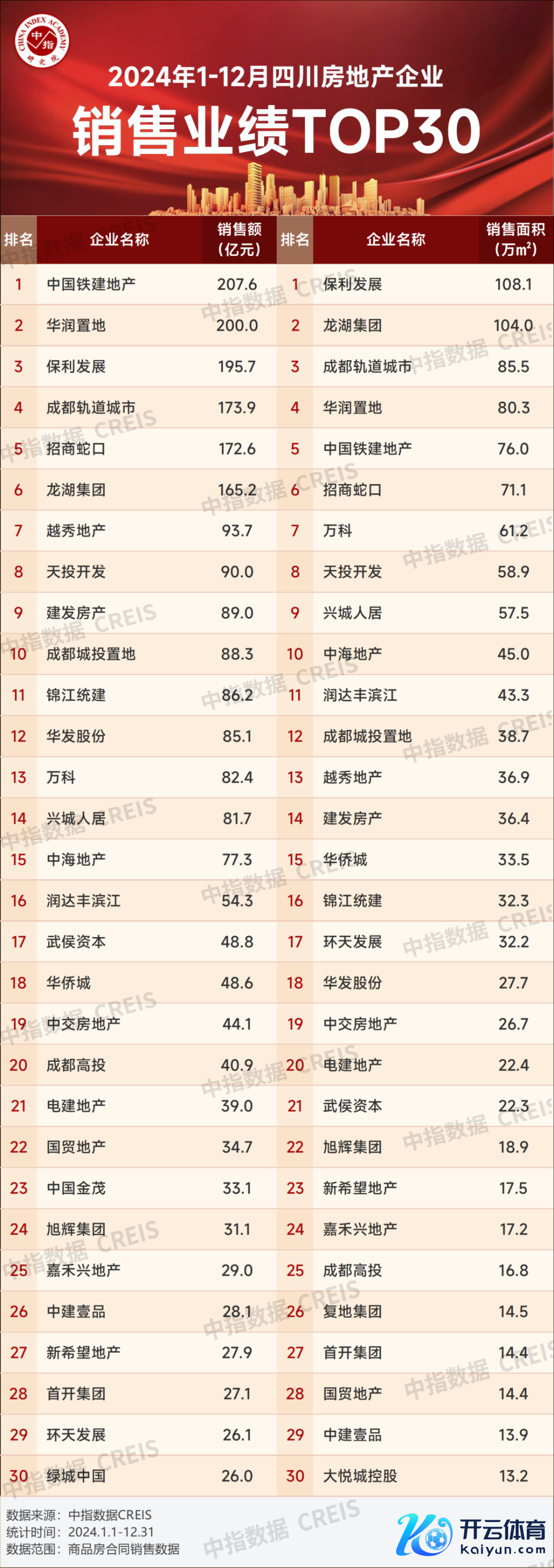 四川省2024年1-12月房地产销售功绩TOP30中,24家房企在川销售金额超30亿元,其中15家房企销售金额超60亿元,分离为中国铁建地产、华润置地、保利发展、成齐轨说念城市、招商蛇口、龙湖集团、越秀地产、天投迷惑、建发房产、成齐城投置地、锦江统建、华发股份、万科、兴城东说念主居、中海地产。