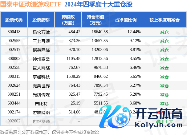 国泰中证动漫游戏ETF为指数型-股票基金,把柄最新一期基金季报泄露,该基金金钱成就:股票占净值比99.4%,无债券类金钱,现款占净值比0.78%。基金十大重仓股如下: