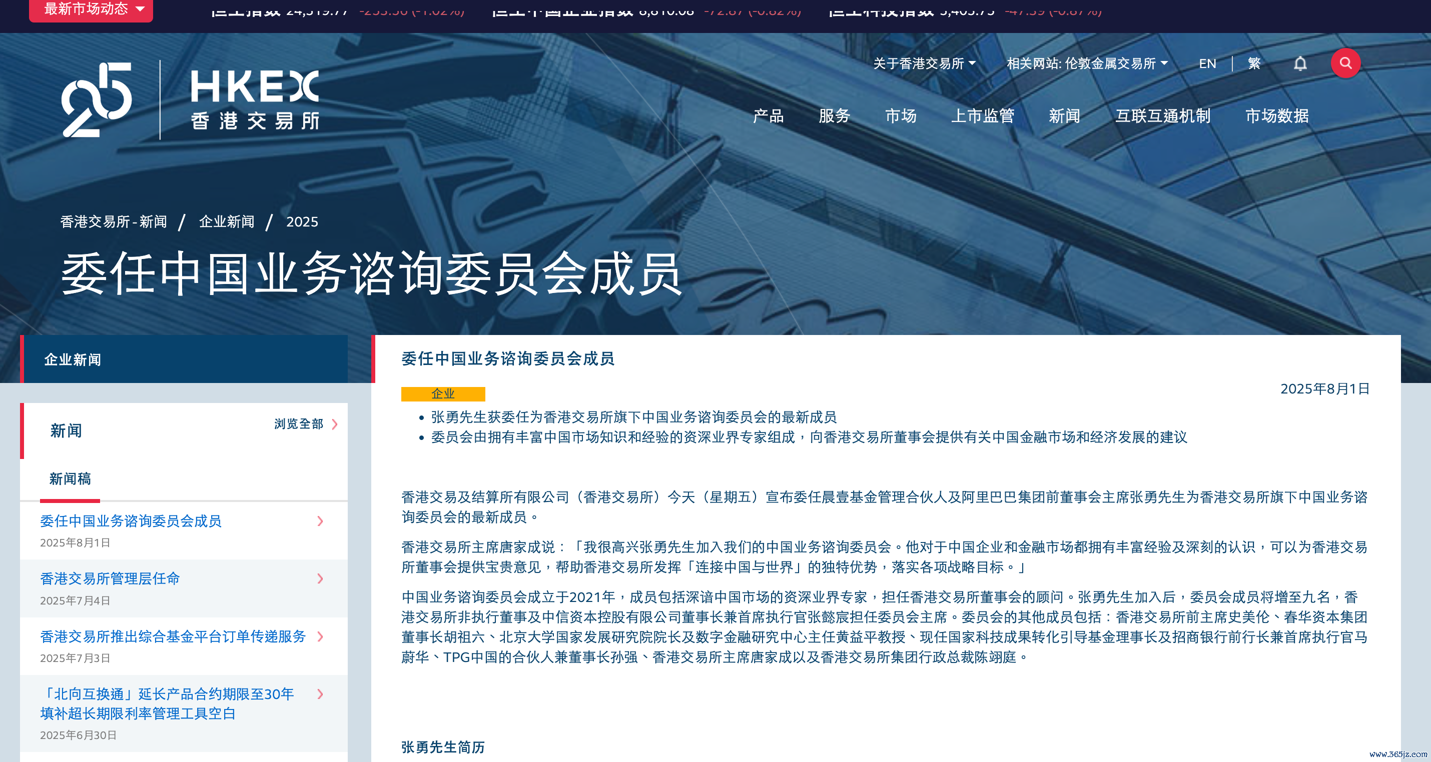 8月1日,香港交往所公告清楚,晨壹基金处分合资东谈主、前阿里巴巴集团董事会主席兼首席实行官张勇获委任为香港交往所旗下中国业务筹商委员会的最新成员。