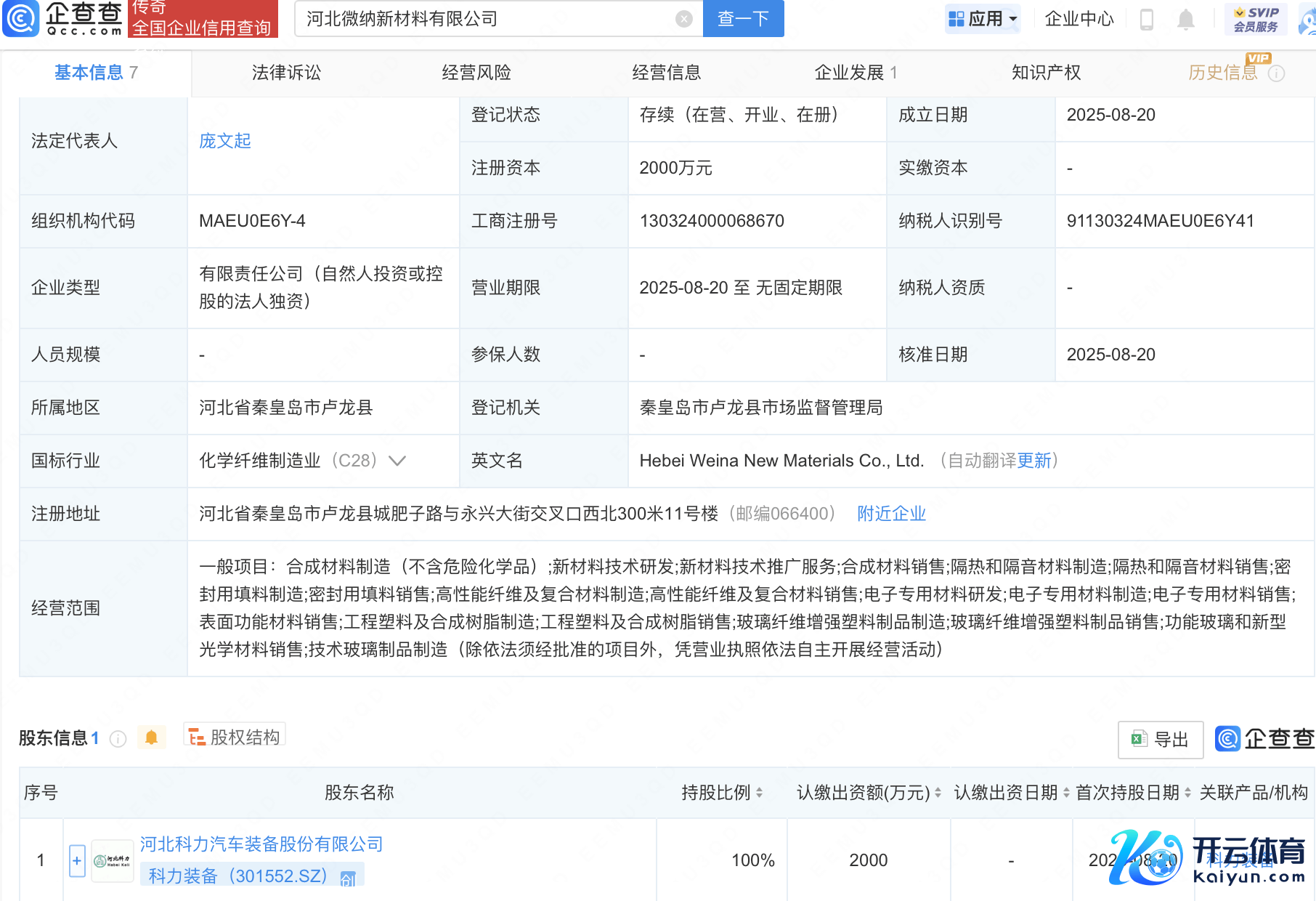 企查查APP涌现,近日,河北微纳新材料有限公司竖立九游体育app娱乐,注册成本2000万元,陆续界限包含:电子专用材料研发;电子专用材料制造;电子专用材料销售;名义功能材料销售等。企查查股权穿透涌现,该公司由科力装备(301552)全资捏股。