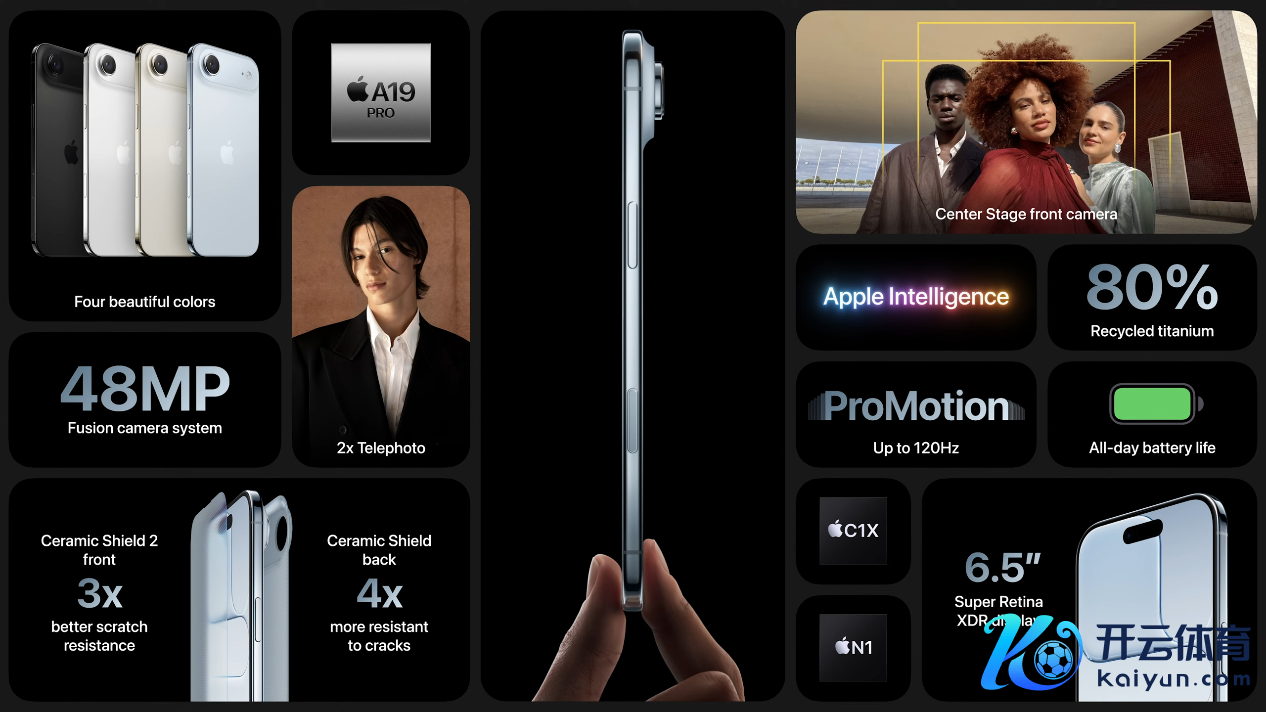 屏幕为 6.5 英寸 ProMotion,性能部分 iPhone Air 搭载最新的A19 Pro 芯片(6 核 CPU + 5 核 GPU),合作全新的苹果无线网罗芯片N1以及C1X基带芯片,带来更快的网罗聚积和更富厚的信号证据。