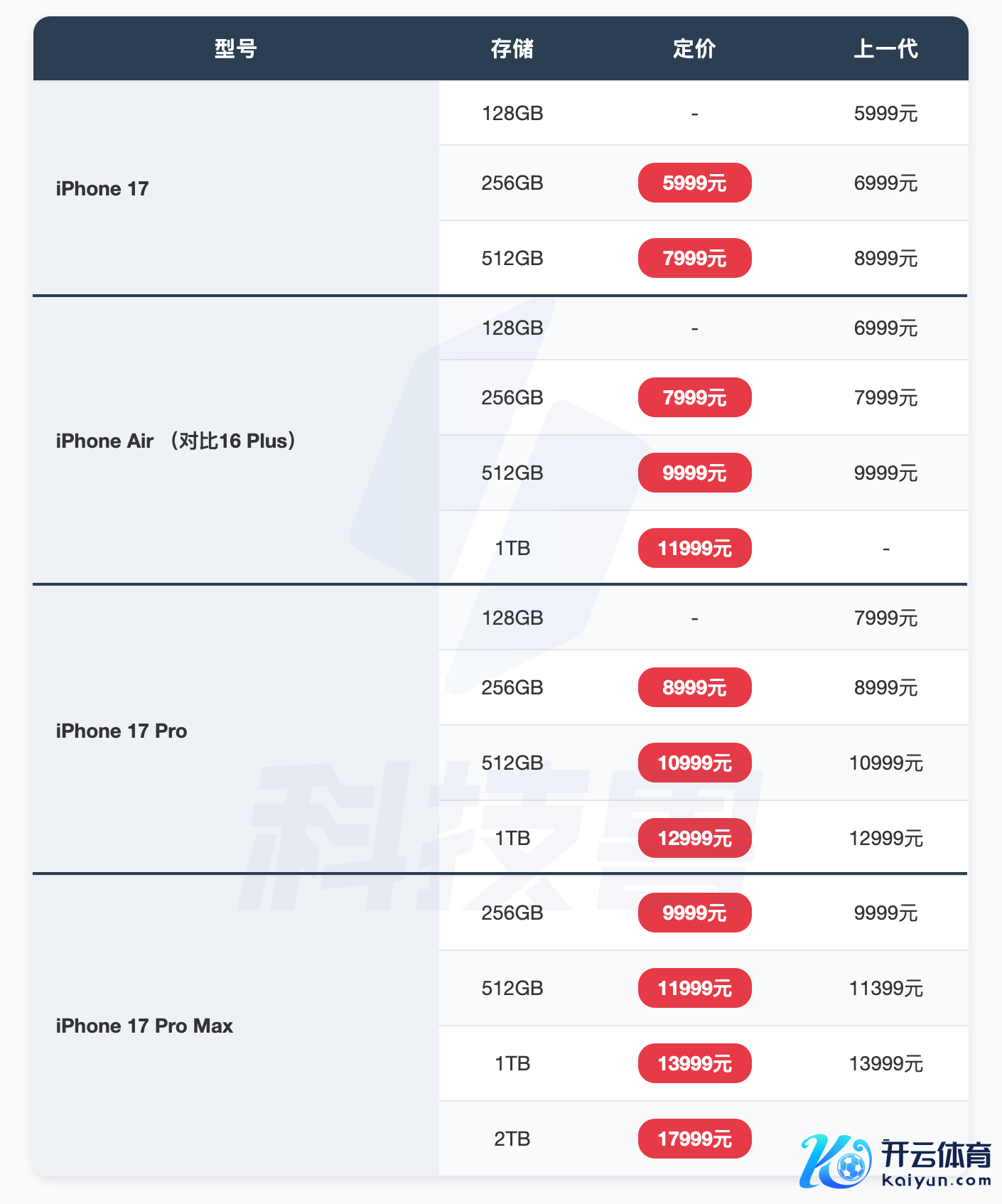 iPhone 17、iPhone Air 以及 iPhone 17 Pro 的订价如下:
