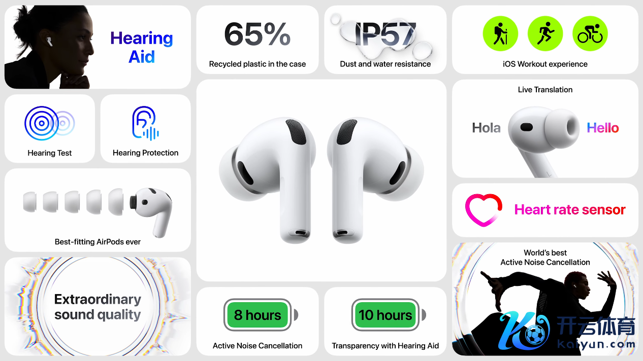 此外,AirPods Pro 3 还加入了心率传感器,通过非可见光脉冲来精确跟测稽查数据。AirPods Pro 3 同期是首款达到IP57 级别的 AirPods,防尘、抗汗、抗水愈加出色。U2 芯片使得其精确查找距离膨胀至 1.5 倍,单次凝听续航也擢升至 8 小时。