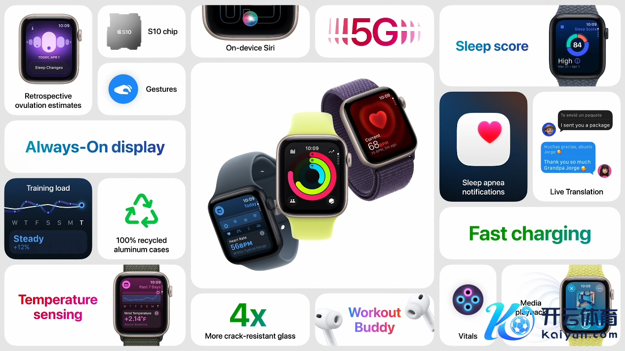 尽管外不雅野心并莫得明显变化,但 SE 3 有不少功能升级。初度加入了全天候透露屏和体温感应功能。S10 芯片的加入也为其带来轻翻手腕、双指互点的手势操作,存储容量提高到64GB。约 1.5 小时最多可充至 80% 电量。