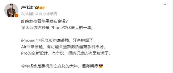 9月10日凌晨,举办了新品发布会,iPhone 17系列厚爱发布。小米对苹果新品进行了点评,称这富裕是iPhone变化最大的一年。 卢伟冰默示,iPhone 17圭臬版真实很强,牙膏挤爆了,Air相配惊艳,有可能会重新激活超薄手机商场,Pro的全新盘算推算,有争议,但辨识度真实是拉满了。本年将会是手机方式变化的大年,值得期待。 卢总关于苹果iPhone 17系列的点评算是相比中肯,圭臬版的牙膏挤爆仍是成了共鸣,毕竟苹果此次在规格上是给的太多了,虽然,也与此前圭臬版过于拉胯有一定联系。Air的纤...