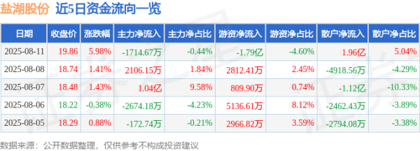 本站音讯,截止2025年8月11日收盘九游体育app官网,盐湖股份(000792)报收于19.86元,高涨5.98%,换手率3.73%,成交量197.56万手,成交额38.89亿元。 8月11日的资金流向数据方面,主力资金净流出1714.67万元,占总成交额0.44%,游资资金净流出1.79亿元,占总成交额4.6%,散户资金净流入1.96亿元,占总成交额5.04%。 近5日资金流向一览见下表: 盐湖股份融资融券信息显现,融资方面,当日融资买入6.96亿元,融资偿还3.87亿元,融资净买入3.0...