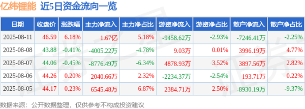 本站音书,领域2025年8月11日收盘现金九游体育app平台,亿纬锂能(300014)报收于46.59元,飞腾6.18%,换手率3.78%,成交量70.45万手,成交额32.24亿元。 8月11日的资金流向数据方面,主力资金净流入1.67亿元,占总成交额5.18%,游资资金净流出9458.62万元,占总成交额2.93%,散户资金净流出7246.41万元,占总成交额2.25%。 近5日资金流向一览见下表: 亿纬锂能融资融券信息显现,融资方面,当日融资买入3.17亿元,融资偿还3.84亿元,融资净...