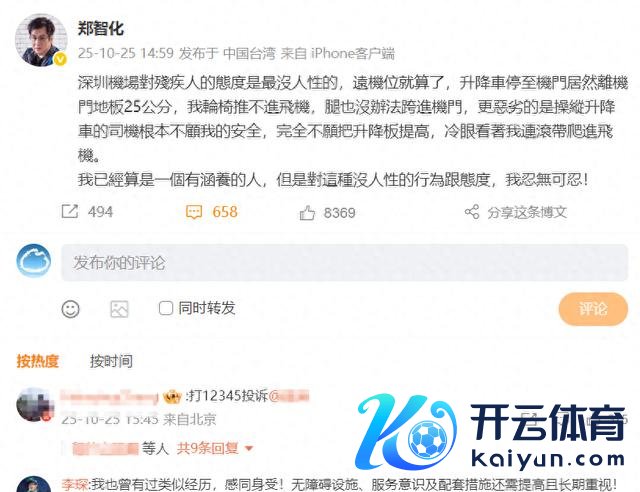 那天在机场九游体育娱乐网,资深歌手郑智化发的一条不长但让东说念主千里下心的动态火了:他坐轮椅准备登机,升降车尽然比机门地板低了整整25公分,推不进去,我方也跨不外去;更气东说念主的是,操作那台升降车的司机像旁不雅者相似白眼看着,任由他“毛骨悚然”上机。郑智化临了写说念:“我是有修养的东说念主,但对这种没东说念主性的行径和魄力,我疾恶如仇!”这句话戳中不少东说念主心。