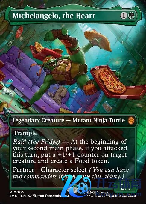 四只忍者神龟中的每一只王人出咫尺多张传奇生物卡牌上。正如预期的那样,拉斐尔偏向激进的红色政策,多纳泰罗天然领有刚硬的神器协同效应。而在该系列的预组带领官套牌中,米活泼基罗则专注于食品。若是你在我方的回合缺点,他会为一个策划生物舍弃一个 +1/+1 指数并制造一个食品繁衍物。那套牌还预装了一些其他独到的食品卡,比如“X 维度披萨龙”(一只能以蹂躏策划生物的玄色披萨恐龙)和“忍者披萨”(一个绿色结界,能抓续产生食品繁衍物,并让你的食品繁衍物产生法力而非还原人命)。