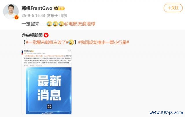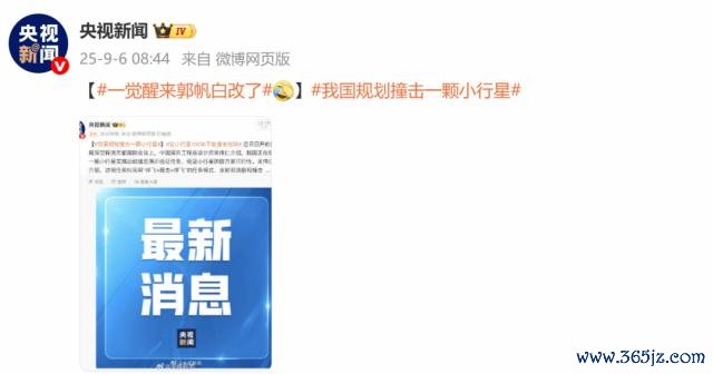 随后,央视新闻将该条"我国策动撞击一颗小行星"的动态截图再次发布,并配文"一醒悟来郭帆白改了"。