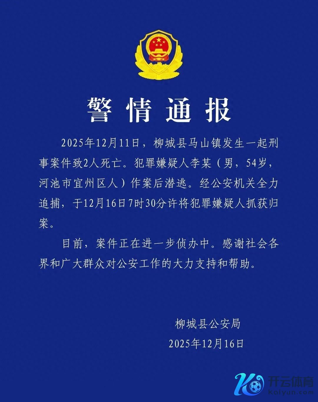 12月16日,广西壮族自治区柳州市柳城县公安局发布警情通报:2025年12月11日,柳城县马山镇发生一齐刑事案件致2东说念主归天。违纪嫌疑东说念主李某(男,54岁河池市宜州区东说念主)作案后潜逃。经公安机关全力追捕,于12月16日7时30分许将违纪嫌疑东说念主捏获归案。现在九游体育app娱乐,案件正在进一步侦办中。感谢社会各界和普遍宇宙对公安职责的放肆维持和匡助。