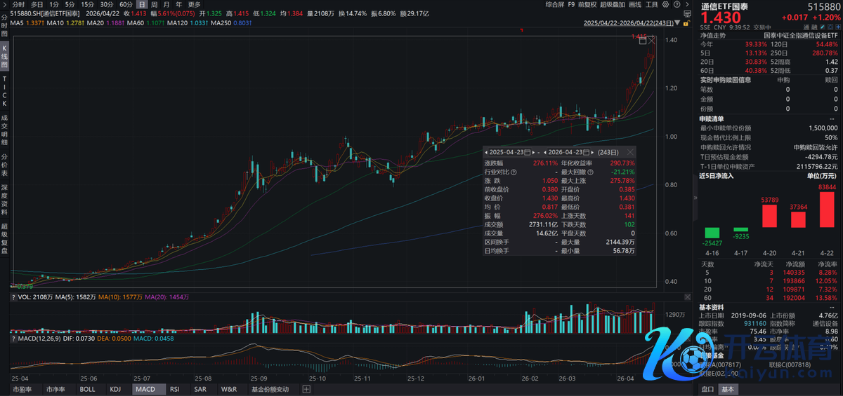 在AI叙事的助力下,限度4月23日写作,通讯ETF(515880)近一年涨幅超276%,居全阛阓ETF第一。