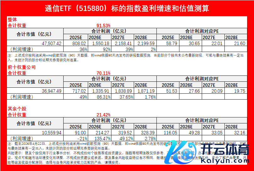 注:数据起首ifind,限度2026/4/22,通讯ETF限制为210.35亿,在同类8只居品中名轮番一,权重占比限度2026/4/22。说起个股仅用于行业事件分析,不组成任何个股推选或投资提议。指数等短期涨跌仅供参考,不代表其往时发达,亦不组成对基金功绩的开心或保证。不雅点可能随阛阓环境变化而调换,不组成投资提议或开心。说起基金风险收益特征各不疏导,敬请投资者仔细阅读基金法律文献,充分了解居品要素、风险等第及收益分拨原则,礼聘与本人风险承受智力匹配的居品,严慎投资。